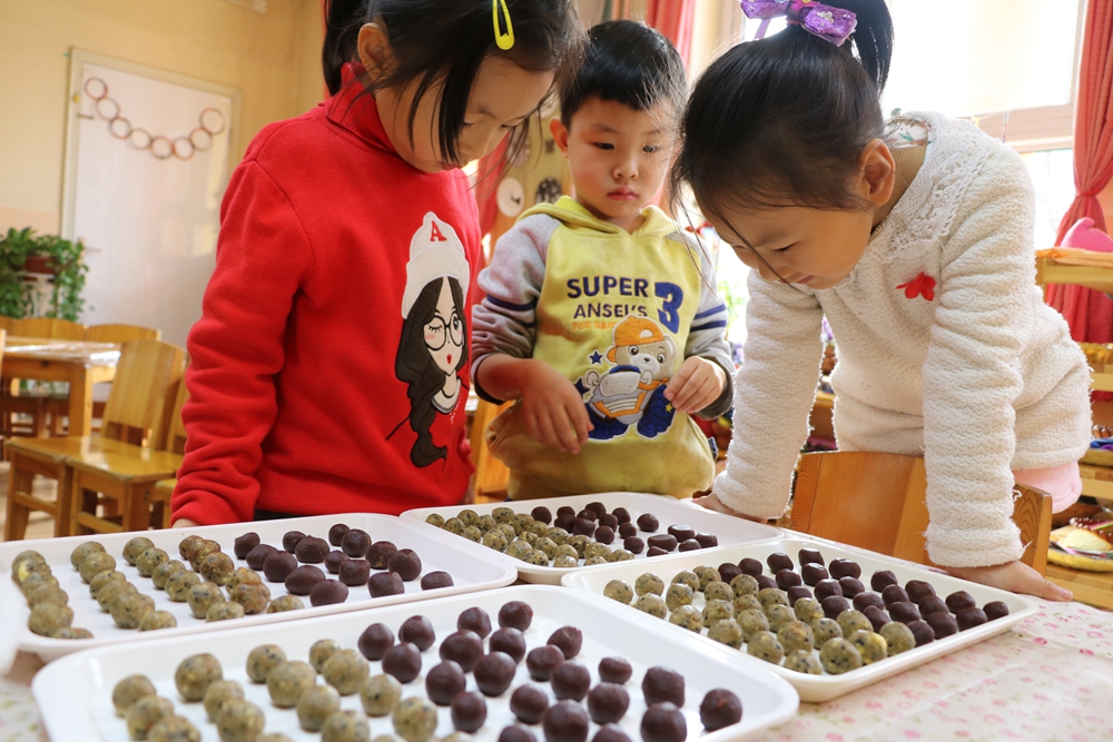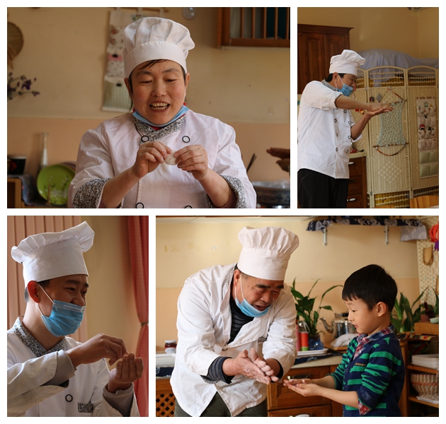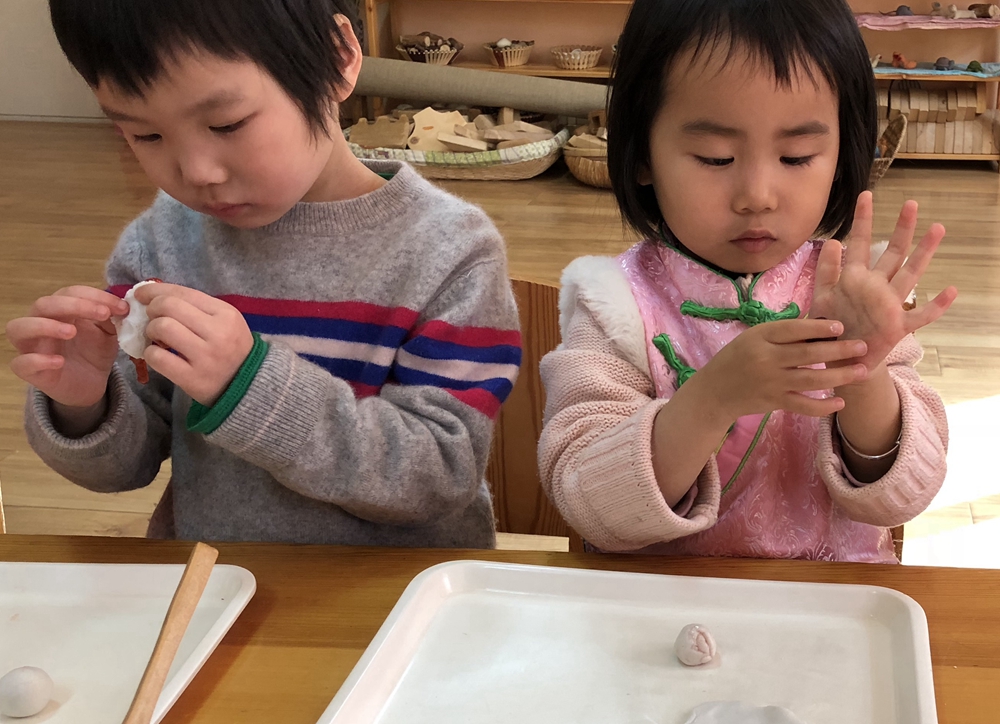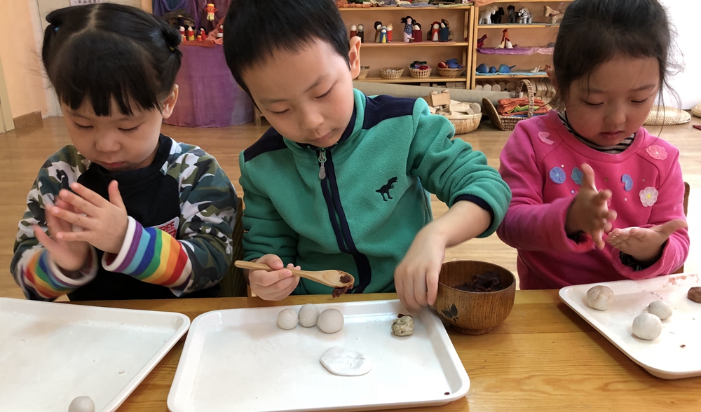 特邀我们的大厨去到各个班级,指导孩子们包汤圆。