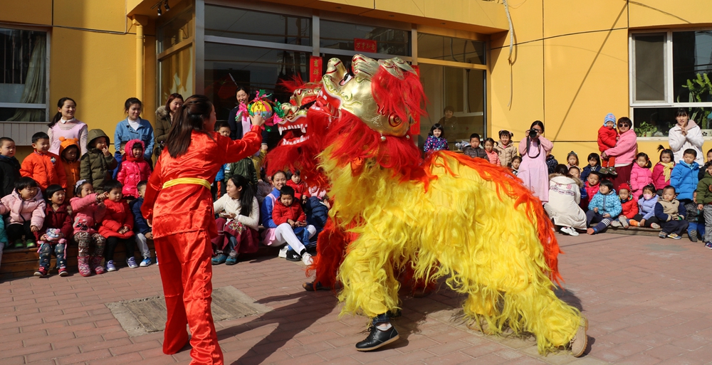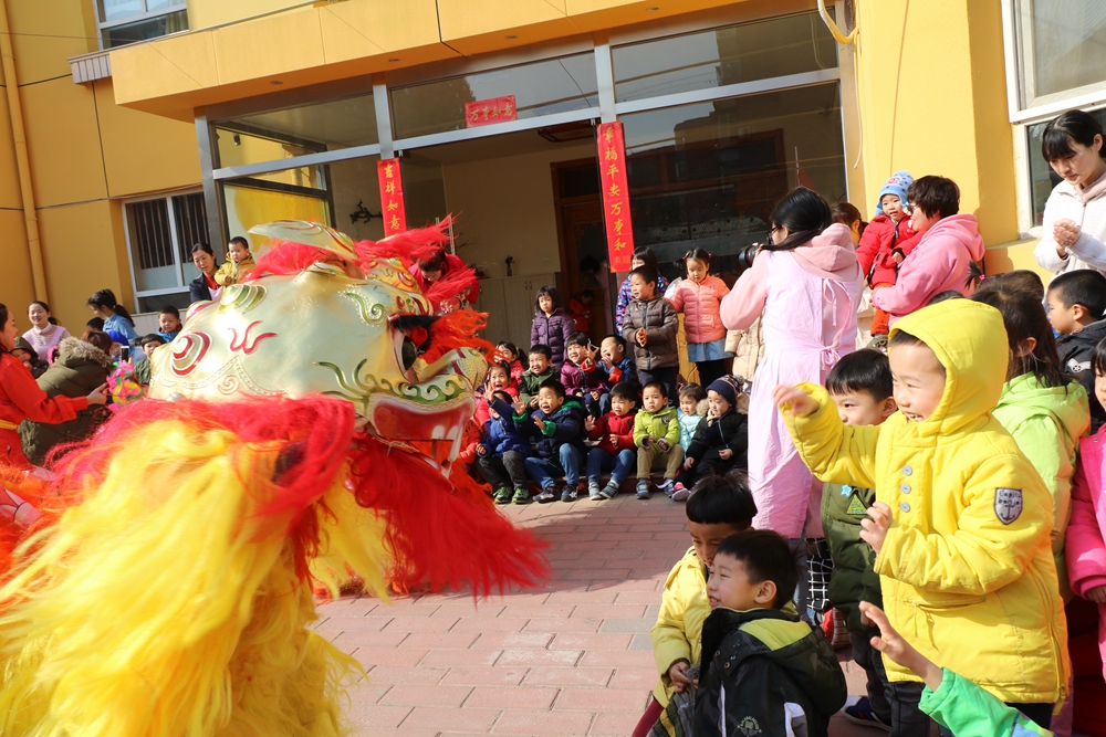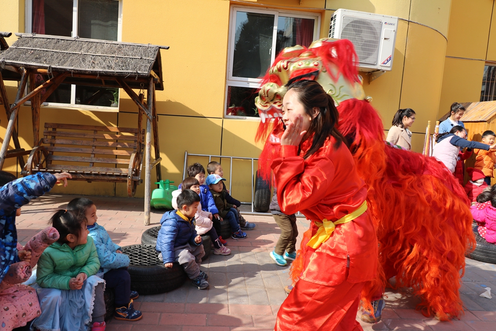 两头可爱的狮子在舞狮老师的带领下,和每一个班级的孩子进行近距离的互动。