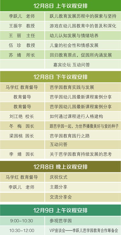 VIP专享:除普通席位的议程外,VIP席位将专享——前排座位、李跃儿芭学园教育合作筹备会(12月9日上午观园结束后进行)