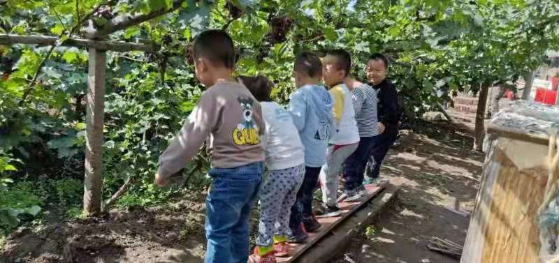 幼儿园户外有供幼儿钻、爬、跳、攀登等活动的大型玩具两套,自制户外玩具若干。设有沙池区、器械区、搭建区、泥巴区、农场区等活动区域。区域设计合理、器械摆放有序,防护措施得当。操场铺有草坪、设有安全跑道。